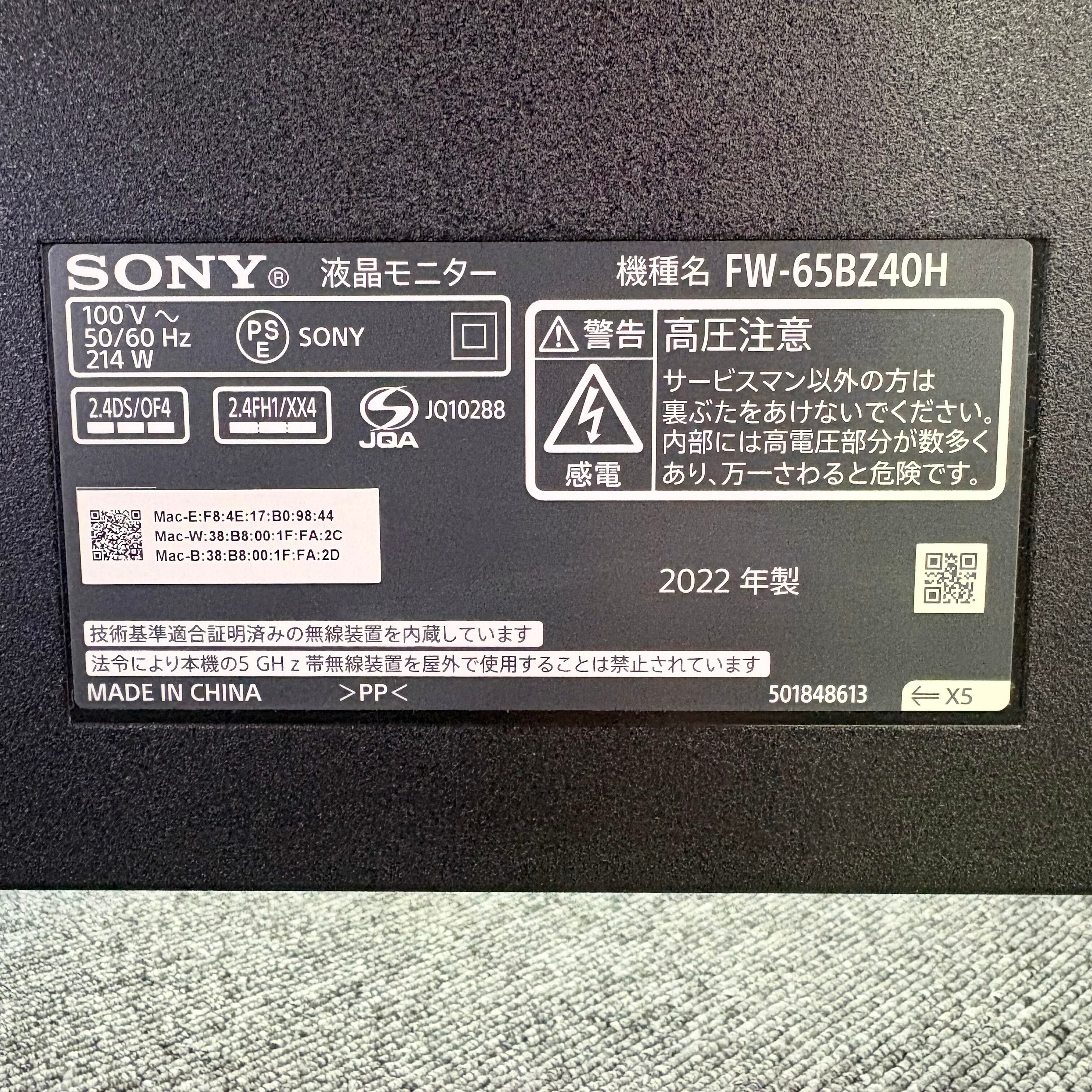 4K液晶モニター/65インチ/SONY/FW-65BZ40H/幅1450mm×奥行903mm×高さ338mm/会議用/店舗サイネージ/1664
